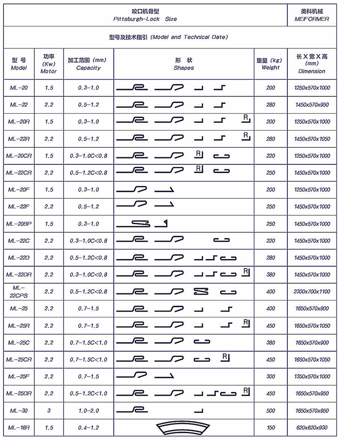 本公司可設計生產各種骨型的咬口機,并可根據客戶需要組成不同工位的機器,見下頁表。