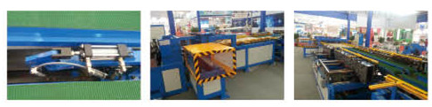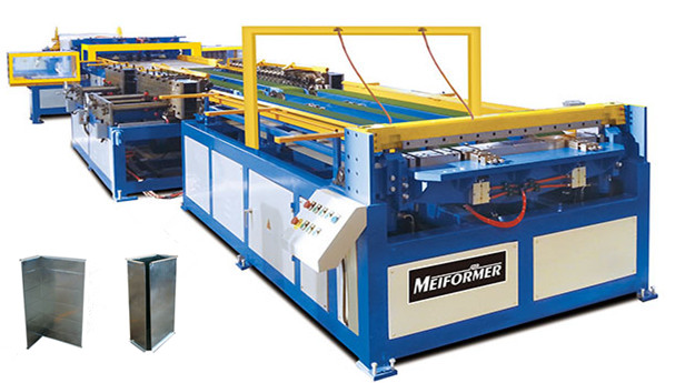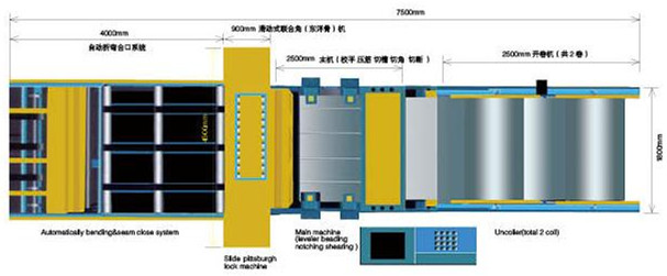 風管5線采用直線型模塊化設計、可全自動實現風管板料的定尺寸剪斷、壓筋、風管的自動切斷、切角、聯合角(東洋骨)、風管共板法蘭自動成型功能及自動折彎成“L”、“U”、 “口”型風管,具有自動化程度高、效率高、省人工、省材料的優點。非常適合大型的風管加工廠。